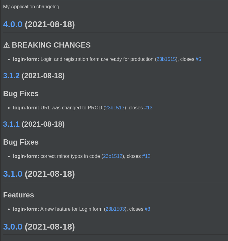 The idea of the application is to maintain previous version (that was already in changelog) and add all new commits (done in a Conventional way) as a release notes between previous and current versions. It makes tag for the updated version in Git and changes previous version to new one in configuration file(s) for the project.